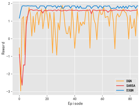Comparison analysis of reward value curves using DQN, SARSA, and D3QN.