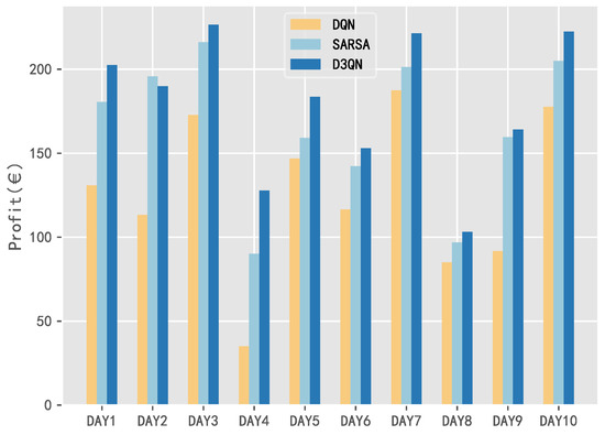 In order to give a more intuitive understanding of the performance difference for DQN, SARSA, and D3QN, this section selects the data from 10 days in a year, and analyzes the daily total profit obtained by the system model with the three algorithms, as shown in Figure 12.