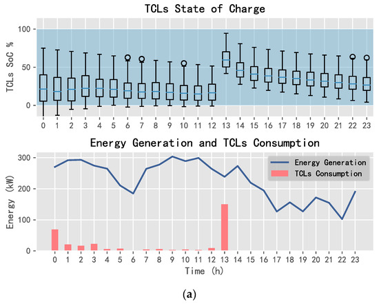 In Figure 14, Figure 15 and Figure 16, the SoC of TCLs reflects the change in indoor temperature for residents. This paper sets the constant temperature range of TCLs as 19~25 °C. When the charging state of TCLs is 0%, it means that the indoor temperature of residents is less than or equal to 19 °C; when the charging state is 100%, it means that the indoor temperature is greater than or equal to 25 °C. It can be seen that SARSA and D3QN can allocate sufficient energy to TCLs when the wind power generation is sufficient, where its state can reach saturation as soon as possible, such that the system can keep the room temperature stable, and gives residents a warm and comfortable experience. In addition, SARSA selects multiple transactions to ensure the income, and D3QN decisively sells a large amount of power to obtain more income when wind energy is sufficient and the electricity price is the highest.