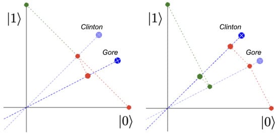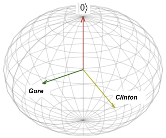 The 2-dimensional nature of the Bloch sphere arising from the use of complex numbers for coordinates adds a useful degree of freedom here, as seen by comparing Figure 1 and Figure 5. In Figure 1, each unit vector is described by a single angle, so the whole system comprising of the initial vector, the Clinton vector, and the Gore vector, is described by just the two angles and . If and , this guarantees that and , so if the angle between these two is guaranteed to be , we would infer that , which is larger than the value of 57% found in experiments. In this one-dimensional model, Clinton’s perceived trustworthiness gets too much of a boost by being associated with Gore’s.