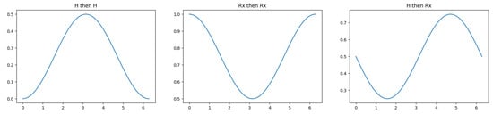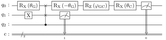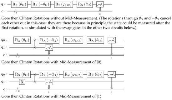 Instead of measuring the state |0⟩ in the basis of the Clinton or Gore axes, an appropriate rotation is applied and then the state is measured in the usual computational basis. These are mathematically equivalent, and enable measurements along any notional axis to be performed while only physically implementing measurement for one axis (typically the z-axis). So, to check “Is A honest?” with honest being the |0⟩ state, we set the state to A and check for honesty, rather than setting the state to honesty and checking for A. Thus, instead of measuring along the Gore axis, we perform an X-rotation through angle and then measure along the standard z-axis to see if the qubit is in state |0⟩ or |1⟩. Or, if we choose not to measure this state but only the Clinton question without the comparative Gore context, we append the gate operators to map from the Gore state to the Clinton state and measure that instead. This gives the topmost circuit in Figure 6.