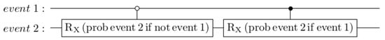 The three components so far are assembled into the following ‘conditional probability with interference’ circuit shown in Figure 13. Figure 14 shows how this circuit behaves with the numbers filled in from the Prisoner’s Dilemma problem above. Event 1 is the partner’s decision result, with state |0⟩ corresponding to ‘Betray’ and state |1⟩ corresponding to ‘Cooperate’. Event 2 is the participant’s decision, with the same correspondences.