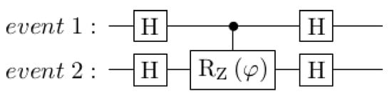 This is not the only option. For example, just applying the gates on the same qubit will produce interference between the two states in a single qubit. Instead, using two-qubit configurations to generate interference enables the model to implement an intuition such as “the uncertainty in event 1 affects the phase change in event 2”. This leads to the circuit structure of Figure 11. Various gates could be used instead of the Hadamard (H) gates, which lead to different relationships between the phase angle and the probability for event 2. Some of these combinations are shown in Figure 12. The decision to use Hadamard gates is a choice that says “if the probability of event 1 is zero, the probability of event 2 will be between zero and one-half”. (This is before any explicit conditional probabilities, based on knowing the outcome of event 1, have been included.)