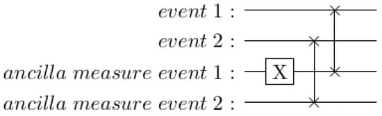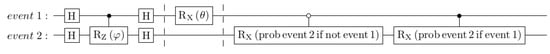 An example is shown in Figure 15. In this case, the X rotation on the “ancilla measure event 1” qubit is used to simulate measuring a |1⟩ rather than a |0⟩ for the first event. Swapping in a |0⟩ qubit for event 2 corresponds just to resetting this qubit.