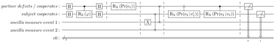 The three components assembled so far can generate the expected probability of event 2 if the outcome of event 1 is unknown. The remaining question is what happens when the outcome of event 1 (such as partner betrays/cooperates) becomes known. In quantum theory, this corresponds to measuring the qubit representing event 1, at which point it collapses to the pure |0⟩ or |1⟩ state. As in Section 5, this can sometimes be modeled without mid-circuit measurement using swap gates and ancilla qubits.