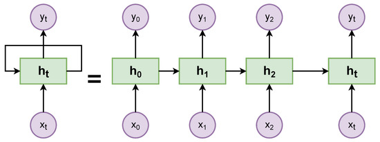 An RNN simulates a discrete-time dynamical system that has an input , an output , and a hidden state . In Figure 3, the subscript represents time. Recurrent neural network architecture is a sequence of neural networks that are connected one after the other by backpropagation. Figure 3 illustrates a displaced RNN. On the left side, the RNN is unrolled after the equal sign; the different time-steps are visualized, and information is passed from one time-step to the next [17].