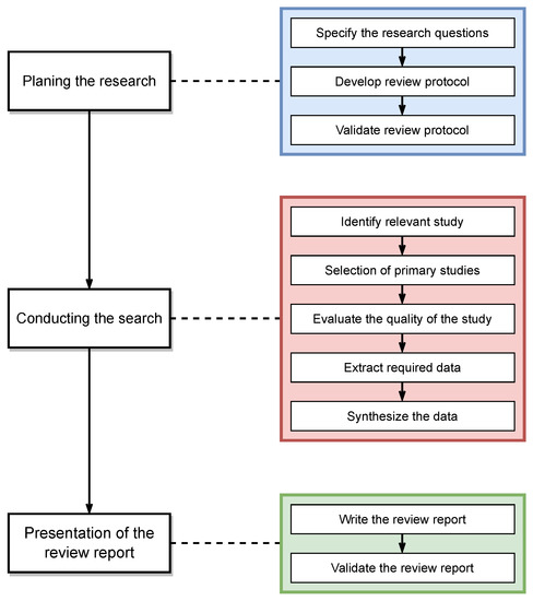 The systematic literature review method is based on the methodology proposed by Barbara Kitchenham [24]. Figure 6 shows the systematic review process used in this work, which consists of three phases: