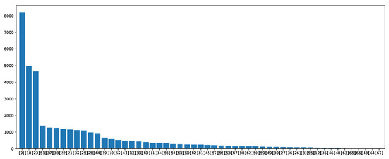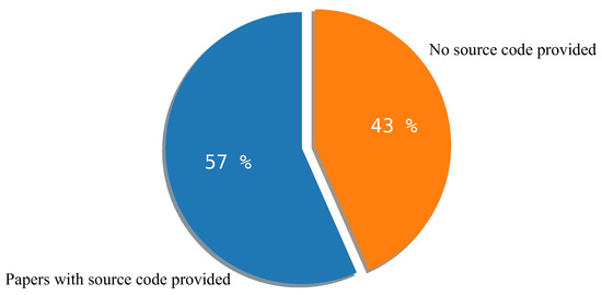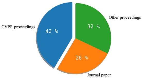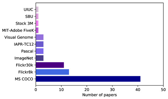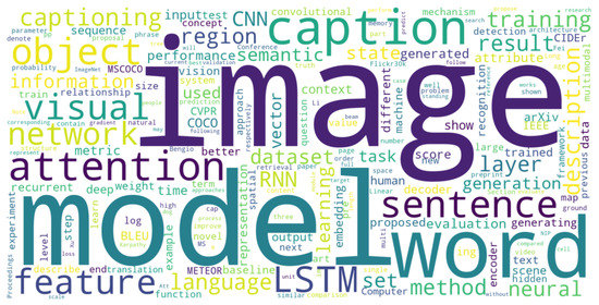 According to the systematic literature review, 53 scientific articles were finally selected. The publication dates of the selected papers fall within the time interval of 2014–2022. The number of citations for each of the publications to date is shown in Figure 7. Of these, 42% were published in the proceedings of the IEEE Conference on Computer Vision and Pattern Recognition (CVPR), the reference conference in the field. Additionally, 17 papers (32%) were published in other conference proceedings. Finally, the remaining 14 papers (26%) were published in research journals, as shown in Figure 8. In addition, it was found that 30 of the 53 publications are available on the web for use by the scientific community in GitHub repositories. It is worth mentioning that some works share their model online [9,12,18,21,22,23,25,26,27,28,29,30,31,32,33,34,35,36,37,38,39,40,41,42,43] (as presented in Figure 9), highlighting the use of the Python programming language in all of them and the use of the TensorFlow and PyTorch frameworks. Figure 10 shows the 200 most repeated terms found in the 53 research papers. The terms “image” and “model” are the most repeated words, but “attention”, “LSTM”, and “sentence” are common terms across all papers. Datasets and metrics also appear in the list: “MSCOCO”, “ImageNet”, “BLEU”, and “METEOR”. Additionally, author names, venues, and online repositories are listed: “Karpathy”, “CVPR”, and “arXiv”.