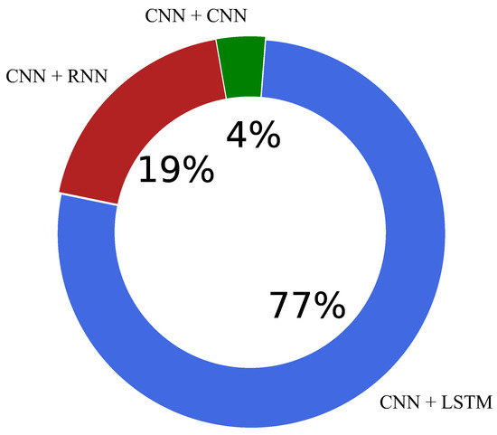 - CNN + LSTM. This architecture uses a CNN encoder and an RNN with LSTM modules to prevent vanishing gradient. Most of the works, including the recent ones (41 out of 53, representing 77%), followed this method.