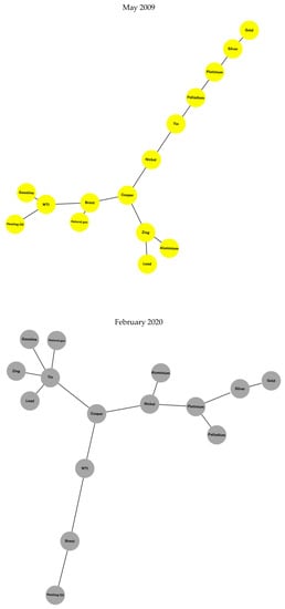 Commodities Minimum Spanning Trees (MST). These figures depict the networks formed by base metals, precious metals, and energy commodities in three different periods of time. The green figure shows the MST in the Subprime Crisis (October 2008), the yellow figure shows the resulting MST in a low volatility period (May 2009), and the gray figure shows the MST during the COVID-19 outbreak (February 2020).