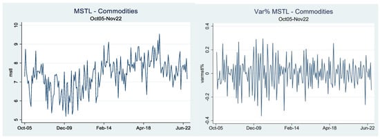 We analyzed the time evolution of commodity market synchronization. Figure 2 exhibits the monthly evolution and the monthly variation of the minimum spanning tree length (MSTL) for the total commodities of our sample for the period October 2005–November 2022. In terms of the behavior of the MSTL, we observe that the time series is dynamic over time, with clear cycles and pathways reaching maximum levels near December 2019 and minimum levels near December 2009. Regarding the monthly variation of the MSTL, we appreciate mild periods of change combined with high fluctuations that broadly range from +30% to −30% monthly. In addition, in terms of the volatility of the monthly variations, the data show two broad periods. The first, with high oscillations near the Great Financial Crisis of 2008–09 and its aftermath, and the second period, with lower volatility variations in the years after.