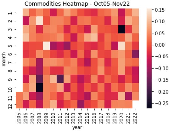 Commodities heatmap. This figure shows the resulting heatmap monthly return of the sample of base metals, precious metals, and energy commodities for the period October 2005 and November 2022. Source: Authors’ elaboration.