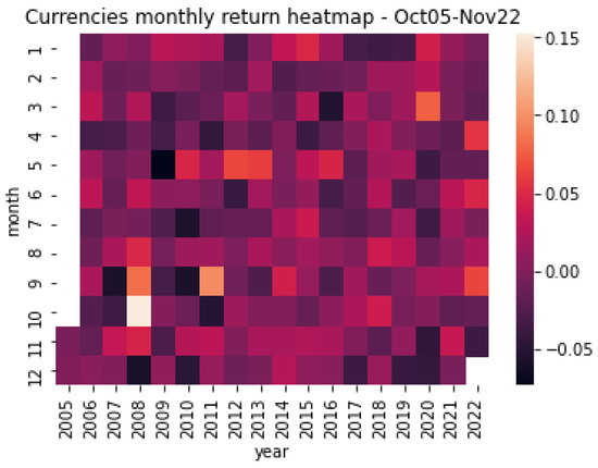Commodity currencies heatmap. This figure shows the resulting heatmap monthly return of commodity currencies for the period October 2005 and November 2022. Source: Authors’ elaboration.