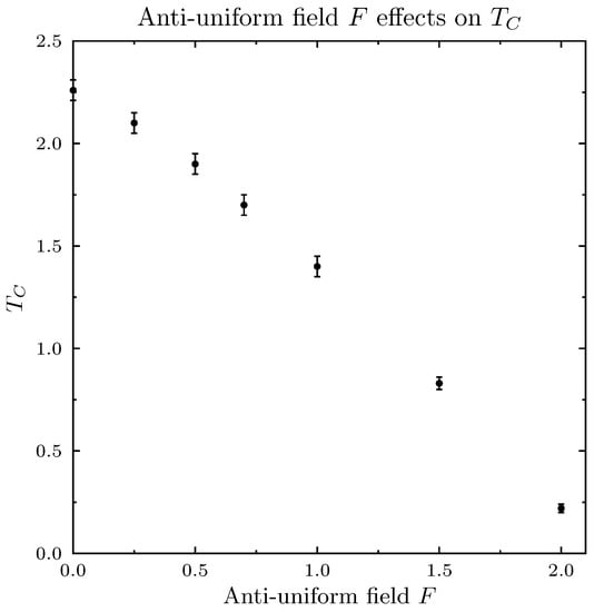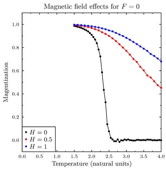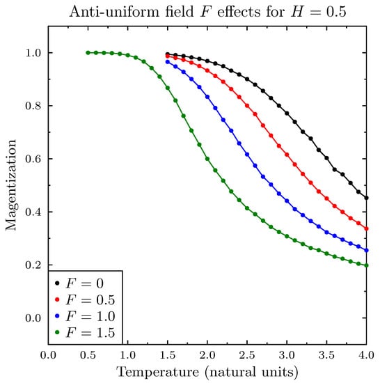 Figure 5 presents the results of the combined magnetic field () and three values of the pro-diversity field ( and ). Even though it is relatively smaller, the magnetic field effect of spreading the phase transition to a wide range of temperatures dominated. Increasing F merely shifted the departure from the fully magnetized state to lower temperatures, preserving the gradual nature of the transition between the magnetized (uniform) and de-magnetized states.