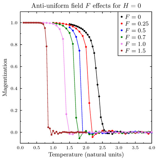 Magnetization as a function of temperature for several values of the pro-diversity field F and for zero magnetic field . Increasing the pro-diversity field F shifted the Curie temperature to lower values (see Figure 4).