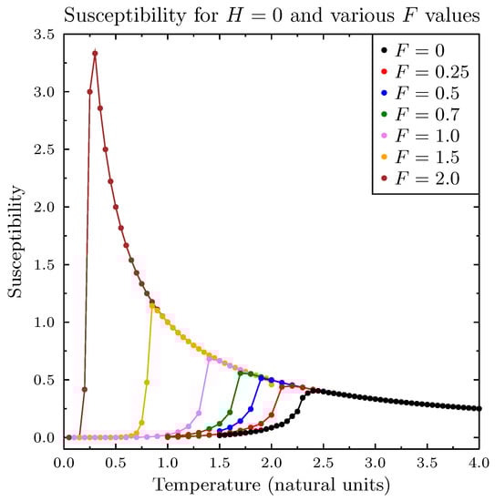Susceptibility as a function of temperature for selected values of pro-diversity field F and for zero magnetic field . Increasing field F shifted the phase transition to lower values. The transition became sharper when increasing F.