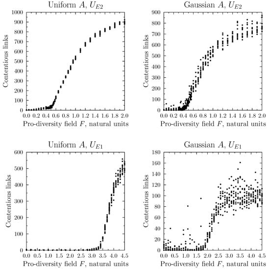 An important difference from the Ising model should be noted here: as the values of agent viewpoints A were taken from a continuous distribution, was close to zero for agents with , regardless of their environment (agents with “neutral” mindsets not “reacting” to the diversity/uniformity of viewpoints of agents around them). This is absent in the original binary Ising model, where the absolute value of spin is fixed.