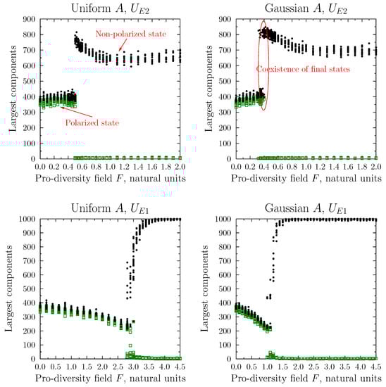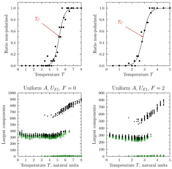 Then, we reduced the dimensions K and L to 1. Therefore, an agent was characterized by a single value A (we interchangeably used the named opinion and spin to emphasize the similarity of the contexts). If we assume that A can take values, we obtain the direct correspondence with the atom spin of the Ising model. However, in addition to reproducing the standard Ising model, our formulation allows its expansion describing combined effects of magnetic field (H) and another type of external influence, which we call “pro-diversity field” (F). Below, we present the results of the simulations of the effects of such modifications.