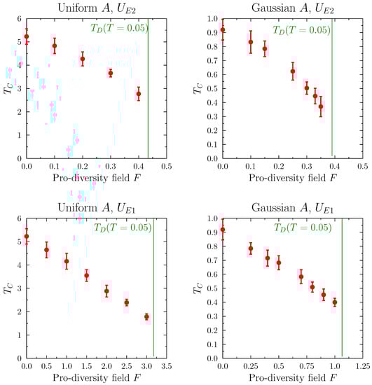 In both cases, F is the strength of the pro-diversity field, a key variable of the model, defining the relative strengths between the interaction part and the pro-diversity one.