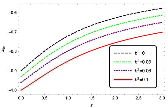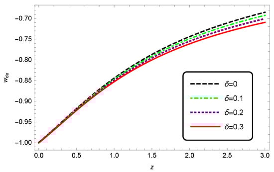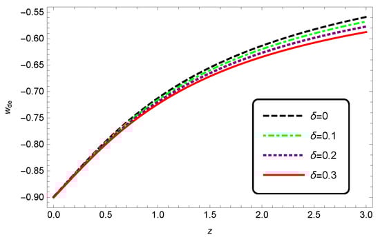 By fixing the Barrow component and changing the values of , we can reveal the effects of the interaction term on the cosmological behavior of our model. In Figure 8, we plotted the evolution of for interacting HDE in modified Barrow cosmology. It was seen that at each time, the value of was higher compared with standard cosmology.