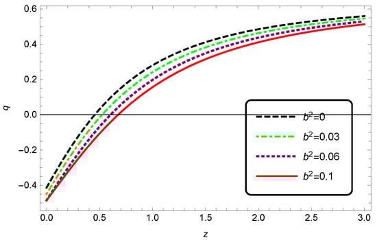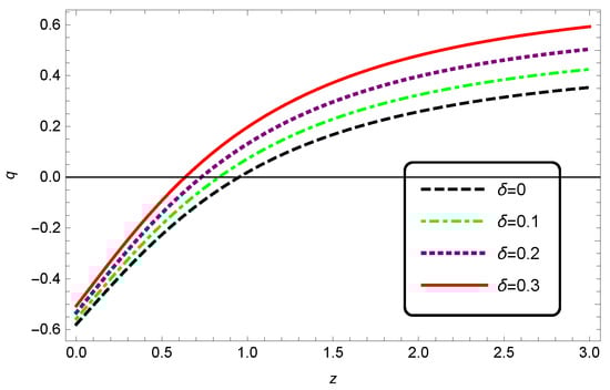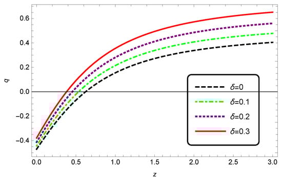 The behavior of the deceleration parameter q as a function of redshift z for non-interacting HDE in Barrow cosmology, where we set .