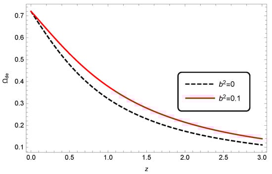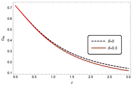 for the EoS parameter of HDE. Note that for , one restores the EoS parameter of HDE in standard cosmology []. We can also obtain the evolution of the density parameter of HDE. By differentiating with respect to time and using the relations in and Equation (14), we arrive at
