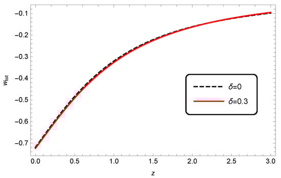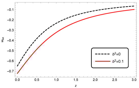 which is independent of the exponent and is similar to the case of standard cosmology [,]. In order to reach , we should have . That aside, for , this model mimics the cosmological constant. Moreover, for , this model can cross the phantom line. The EoS parameter of total energy and matter is defined by