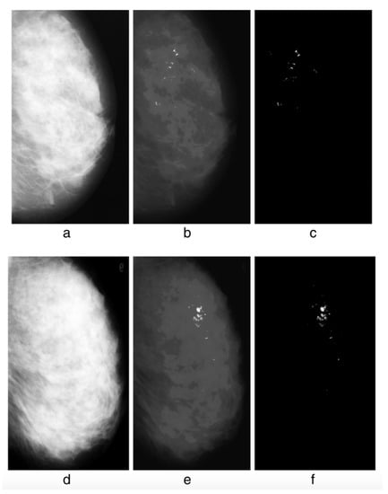 Without q-entropy enhancement with , detection of microcalcifications is limited: 80.21% Tps (true positives) with 8.1 Fps (false positives), whereas upon introduction of the q-entropy, the results surge to 96.55% Tps with 0.4 Fps. Detection results from the experiment: (a) mdb236, (b) output with the Mcs enhanced, (c) output with the Mcs extracted; (d) mdb216, (e) output with the Mcs enhanced, (f) output with the Mcs extracted. From [10].