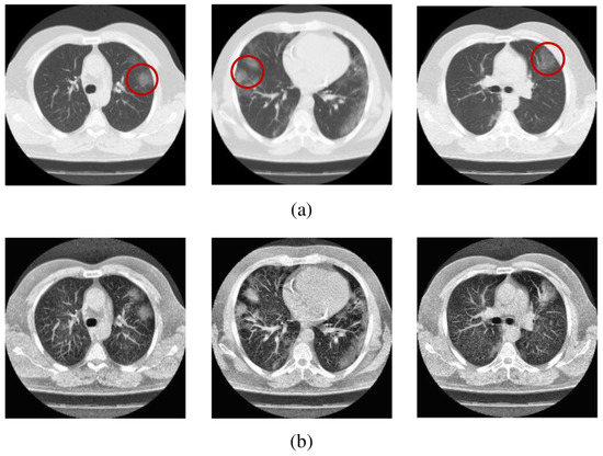 Sample scans from the dataset before and after enhancement showing infected lungs. (a) Original computer tomography scans, with red circles highlighting some regions where fibrosis can be seen; (b) enhanced computer tomography scans using . Further details can be seen in [13].