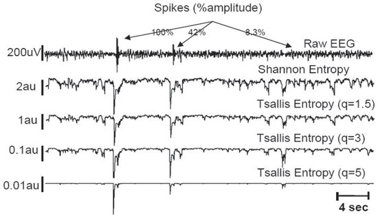 Signal processing of the EEG for direct medical use has been proposed for brain injury following serious events, such as cardiac arrest or asphyxia [31]. Typical results are indicated in Figure 5 (where the highest sensitivity of the recovery EEG is achieved for ) and Figure 6 (where artificial low-amplitude spikes become detectable after (entropic) processing with ). Further biomedical applications are described in [32,33,34,35,36,37,38,39,40,41,42,43,44].