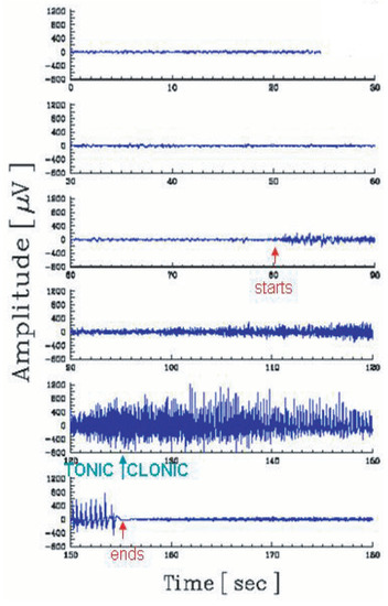 Electroencephalogram (including the contribution of muscular activity) during an epileptic crisis, which starts at 80 s, and ends at 155 s. By direct inspection of the EEG, it is virtually impossible to detect the (clinically dramatic) transition (at 125 s) between the tonic stage and the clonic stage of the patient. Further details can be seen in [42].
