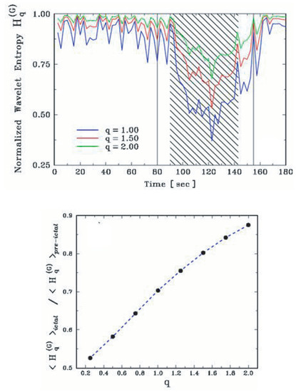 (Top panel) After processing (of the EEG signal), which includes the use of the entropic functional , the precise location of the tonic–clonic transition becomes very visible. (Bottom panel) The effect is even more pronounced for values of q going below unity. Further details can be seen in [42].
