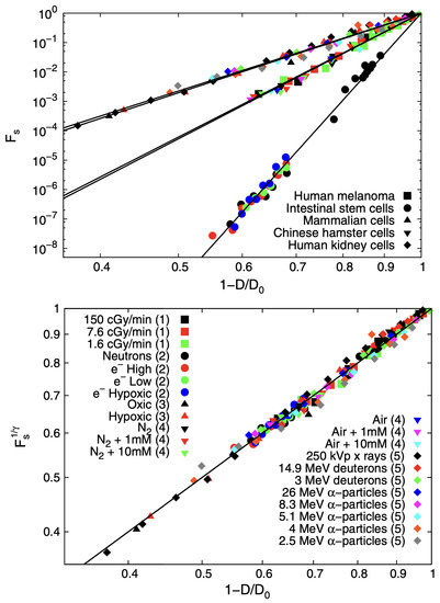 (Top panel) Survival fraction as a function of the rescaled radiation dose for different tissues: intestinal stem cells, Chinese hamster cells, human melanoma, human kidney cells, and cultured mammalian cells under different irradiation conditions. Various shapes represent tissues, whereas each color highlights different radiation conditions. Five solid lines represent fitting to experimental data. (Bottom panel) Collapsed survival fractions for different tissues with : intestinal stem cells , Chinese hamster cells , human melanoma , human kidney cells , and cultured mammalian cells under different irradiation conditions. Further details can be seen in [45].