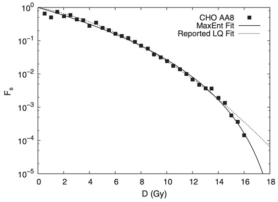 Comparison between the current linear-quadratic (LQ) BG-like exponential model best fit and the present q-exponential model fitted to and for the cell line CHO AA8 under 250 k-Vp x rays. Further details can be seen in [45].