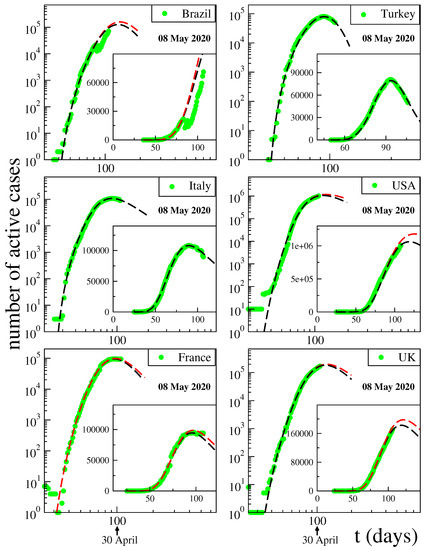 with , and . The constant indicates the first day of appearance of the epidemic in that particular country (or region). The normalising constant C reflects the total population of that particular country. For , if , we recover the standard q-exponential expression; if , it is currently referred to in the literature as q-Gaussian; for other values of , it is referred to as stretched q-exponential. Through the inspection of the roles played by the four nontrivial parameters, namely , it became rather transparent that depend strongly on the epidemiological strategy implemented in that region, in addition to the biological behaviour of the coronavirus in that geographical climate. In contrast, the parameters appear to be fairly universal for COVID-19, mainly depending on the coronavirus itself. See Figure 11 for typical results in May 2020.