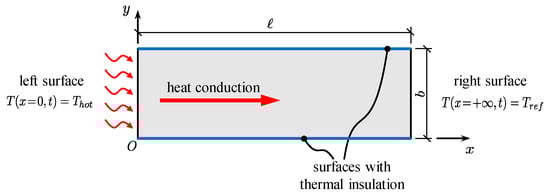 The approximate approach of the nonlinear heat conduction is compared with Finite Element simulations for validation. A concrete plate, characterized by an isothermal initial configuration of temperature , was considered. This temperature was assumed to remain constant at the right surface of the plate, whereas the left surface was subjected to a sudden temperature increase to at the time instant: . By considering the other surfaces to be thermally insulated, this leads to one-dimensional heat conduction along the x-direction of the plate, see Figure 1.