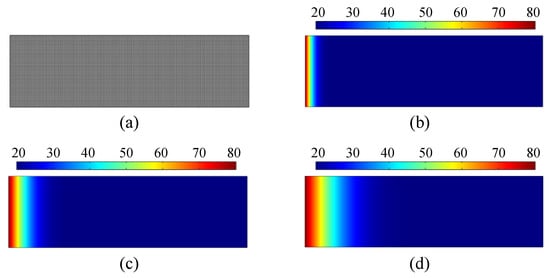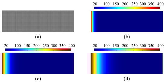 Numerical simulations of the transient nonlinear heat conduction along the length direction of the plate: (a) the Finite Element mesh, and the quantified temperature field at time instants of (b) , (c) , and (d) after the thermal shock.