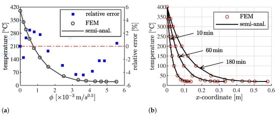 A comparison of the semi-analytical solution with the Finite Element simulation is illustrated in Figure 5, which agrees well. The relative errors of the semi-analytical solution, compared to the Finite Element simulation, are quantified by recalling Equation (50), with their maximum absolute values smaller , see Figure 5a. This validates the applicability of the established semi-analytical approach for fierce fire scenario, where the temperature-dependence of all the three thermophysical properties, i.e., the mass density, specific heat capacity, and thermal conductivity, are activated. The temperature distributions along the x-coordinate of the plate at the time instant of 10 min, 60 min, and 180 min after the thermal shock are illustrated in Figure 5b. The temperature is nonlinearly distributed along the length of the plate, with significant temperature gradients prevailing in the vicinity of the heated surface. This leads to the mismatch of the expansive thermal eigenstrain of concrete and, thus, compressive stresses in parallel to the heated surface, which may lead to brittle spalling of the surface concrete [48,49]. At the time instant of after the thermal shock, the outermost -thick concrete is heated. As heat conduction proceeds, this thickness progressively increases to around at time instant of after the application of the sudden heating. The temperature at the far-field boundary keeps constant at the reference temperature.