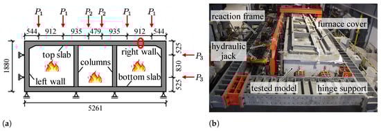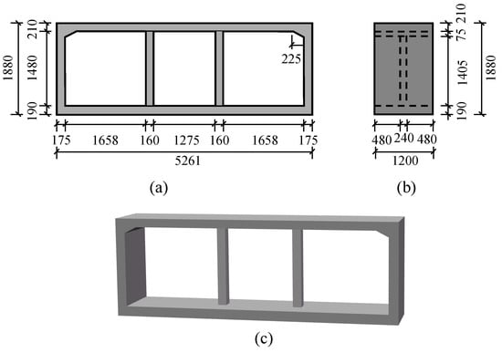 The tested structure was stimulated by the station hall layer of a typical subway station in China, in the form of a closed-cell reinforced concrete frame. The tested model represents the substructure at a reduced geometric scale of 1:4, see Figure 6 and details in [40]. Geometrical dimensions of the model read as in width, in height, and in axial length. Its cross section was subdivided into three spans by two rectangular columns in-between. The concrete used for the tested structure was normal concrete of grade C50, in accordance with [50]. The type of the steel bars was Grade HRB400, according to Chinese standard [51].