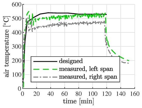 As for the test setup, the structural model was placed sidelong on the top of a furnace and closed with a fire-resistant cover. Vertical and horizontal earth pressure were simulated by hydraulic jacks acting on the top slab and the right wall, as three sets of concentrated loads. The bottom slab and on the left wall were supported by hinge supports, see Figure 7. The magnitudes of the applied concentrated loads are presented in Table 1. After the application of the mechanical loading, the fire test started. The structure was heated by eight burner nozzles in the furnace, with the temperature of the inside air following the designed temperature history, see the solid graph in Figure 8. The temperature increased quickly to a magnitude of around within the first and then kept almost constant till the time instant of . It was followed by natural cooling of the structure by the termination of the applied fire loading. The designed temperature history was determined by simulating the unfavorable fire scenarios in subway station, see [40] for details. The evolution of the air temperature of both the left span and right span of the structure was monitored during the test, which generally agrees well with the designed temperature curve, see Figure 8.