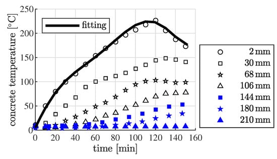Identification of the temperature field is the prerequisite for performing a thermomechanical analysis of the behavior of thermally-loaded concrete structures. For example, following the simplified “ isotherm method” recommended by Eurocode 2 [9], concrete with a temperature over is ignored, while that with a temperature below is considered to maintain its full strength, in quantification of the bearing capacity of concrete members. More sophisticated prediction of the structural performance is related to calibration of the thermal degradation of concrete materials [8,10] and thermal stresses [11,12], as a result of the temporal and spatial evolution of temperature fields. Furthermore, the heat transfer process is also influenced by the mass transfer [13,14], as a result of vaporization and dehydration, and the cracking [15,16], as a result of mechanical response. In this aspect, hygro-thermo-chemo-mechanical models were also proposed [17], which is beyond the scope of this work.