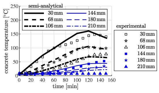 The temperature fields of the top slab, obtained from the engineering mechanics analysis [54] and the semi-analytical approach, were compared, see Figure 11 for the results at the time instant of 30 min after the start of the fire. Generally, the quantified temperature fields are quite similar and agree well with the experimental measurements, see the circular markers in Figure 11. The former analysis was conducted by assuming constant thermophysical properties of concrete, whereas their temperature-dependence is considered in application of the semi-analytical approach. As regards the time-dependent boundary condition, the continuous temperature history is fitted by a polynomial and directly substituted into Equation (44) in the semi-analytical approach, instead of discretization. The similarity of the presented results also indicates that the temperature-dependence of the thermophysical properties is of minor importance for the investigated moderate fire scenario, where the temperatures of concrete at all positions are virtually smaller than . However, the nonlinearity of the heat conduction problem, related to the temperature-dependent thermophysical properties of concrete, shall be addressed in case of fierce fire scenarios. This is discussed in the following.