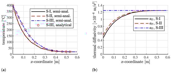The semi-analytical solution of the heat conduction, considering thermophysical properties of S-II and S-III, was established, following the aforementioned strategy. Generally, heat propagates similarly along the length of the plate, whereas the speed of the conduction process differs. Temperature distributions along the length of the plate at the time instant of for the three investigated scenarios are illustrated as Figure 12a. Apparently, heat intrudes faster in case of S-III, compared to that of S-I and S-II. For example, at the time instant of 180 min, the magnitude of is reached at the depth of 0.1675 m, 0.1685 m, and 0.2062 m for S-I, S-II, and S-III, respectively; the magnitude of is reached at the depth of , , and for S-I, S-II, and S-III, respectively. This is attributed to the temperature-independence of the thermal conductivity in case of S-III. The latter stays constantly equal to , whereas the ones for S-I and S-II decreases progressively with increasing temperature, following Equation (51). However, the influence of the temperature-dependence of the mass density and the specific heat capacity is of minor importance; see the comparison of the solid and dashed graphs in Figure 12a. Finally, it is worth mentioning that analytical solution is available in case of linear transient heat conduction, i.e., S-III, reading as [55,56]