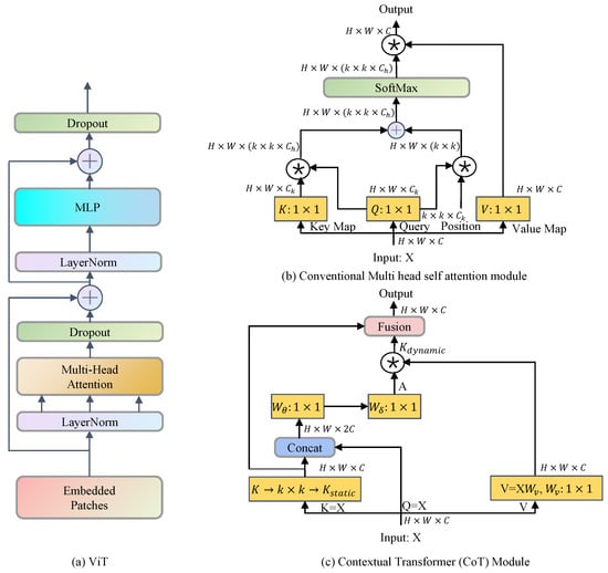 The traditional multi-head self-attention mechanism widely adopted in the visual model backbone in transformer-based approaches [], as shown in Figure 2b, is capable of triggering feature interactions between different spatial locations. However, this mechanism has limited capacity to perform visual representation learning on 2D feature maps, as it does not explore the rich contextual information between query–key pairs, which are learned independently through isolated query–key pairs. To address this issue, Li et al. [] proposed a new transformer-based module, the contextual transformer (CoT) block (Figure 2c), which integrated contextual information mining and self-attention learning into a unified architecture.
