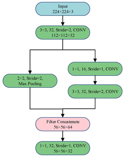 A comparison between the focus module and single-layer convolution revealed that the former had about 400% more parameters and FLOPs. Additionally, while the standard convolution could be readily adapted to various formats, such as ONNX, TensorFlow, and TensorFlow Lite, the same could not be said for the focus module, which was not a generic structure and was not widely supported by many deep-learning frameworks. Given the factors of parameter count, FLOPs, and model applicability, this study proposed replacing the focus module with a stem module []. As opposed to the focus module, the stem module provided a plug-and-play solution that offered richer feature expression without incurring additional computational overhead. Figure 3 shows the specific structure of the stem module, which consisted of a 3 × 3 convolution with a stride of 2 for rapid reductions in dimensionality, followed by a dual-branch structure, with one branch using a 3 × 3 convolution with a stride of 2, and the other branch using a max-pooling layer.