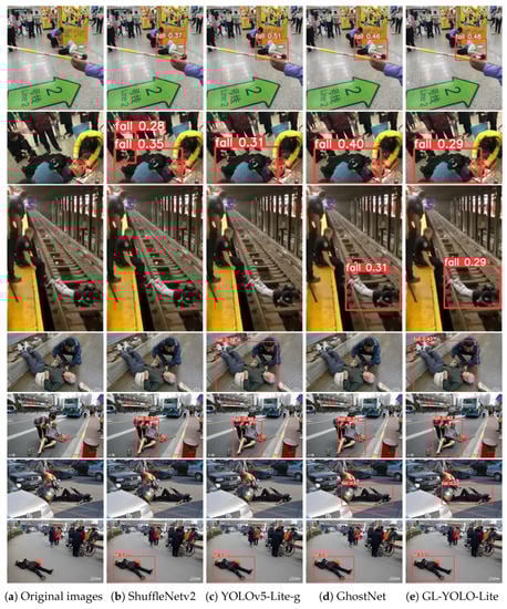 Detection results by GL-YOLO-Lite and other representative algorithms. The ground truth for each image was fall. The images in the Rows 3–7 were collected from the web separately and were not included in the FPDD.