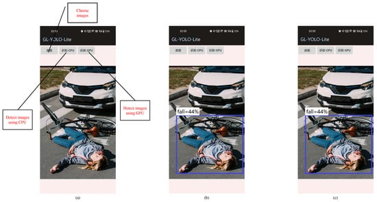 The Android application: (a) the app user interface, (b) images detected by the CPU, and (c) images detected by the GPU.