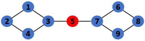 Schematic diagram of betweenness centrality. The betweenness centrality of nodes 1–9 is {0.107, 0.018, 0.554, 0.107, 0.571, 0.107, 0.554, 0.018, 0.107}, and node 5 has the highest betweenness. That is, node 5 connects two clusters, {1, 2, 3, 4} and {6, 7, 8, 9}.