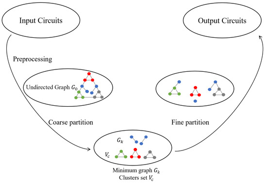 Schematic diagram of the three-way partition of the circuit under a two-level partition structure. During the preprocessing phase, all the electronic components in the circuit are unified, and the undirected graph is outputted. During the coarse partition phase, the clustering algorithm reduces the scale of and outputs cluster set Vc and minimum graph . During the fine partition phase, the improved genetic algorithm assigns nodes in to each cluster and outputs the circuits with the minimum cutsize.