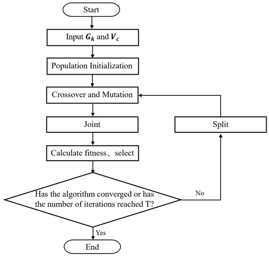 Moreover, to ensure that crossover and mutation do not impact the absolute genetic genes, the absolute genetic genes in the complete chromosomes are removed before the next round of evolution, and the remaining genetic information is copied as a new short chromosome to achieve crossover and mutation. This process is realized by the Split function. On the other hand, we also define the Joint function to add absolute genetic genes to a short chromosome to recover a complete chromosome. The flowchart of the entire genetic algorithm is shown in Figure 5.